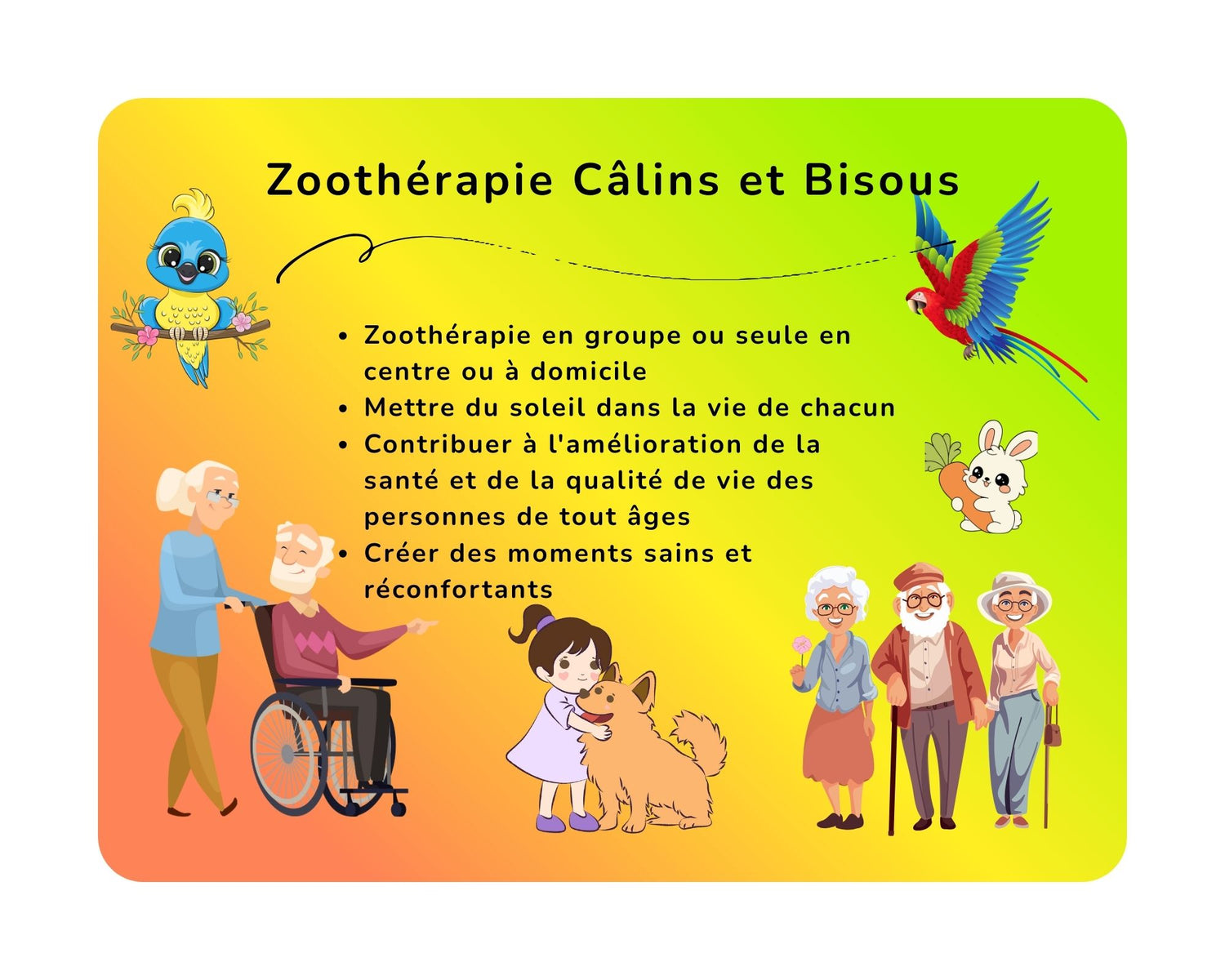 Zoothérapie professionnelle pour enfants et adultes. Séances personnalisées avec nos super compagnons à poils et à plumes, en résidence, à l'école ou à votre domicile.